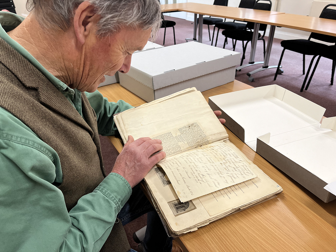 Tim Laycock, looking through the many scrapbooks kept by William Barnes.